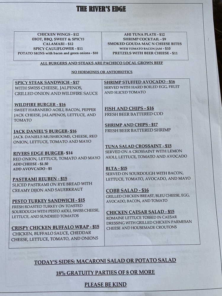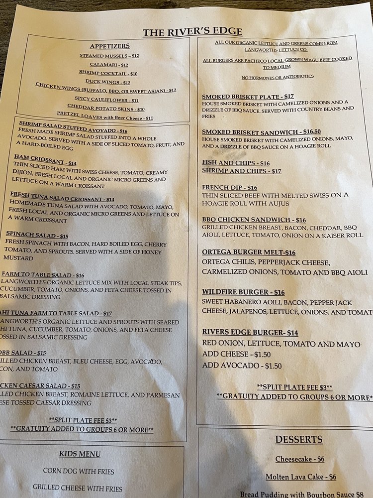 Introducing The River's Edge, a charming venue in Knights Ferry, CA, offering a modern yet historic ambiance. With friendly staff and a range of amenities like free Wi-Fi, full bar, and outdoor seating, this spot is perfect for a casual meal or a special event. Customers rave about the delicious tuna melt, crunchy buttery bread, and creative cocktails crafted by bartender Michelle. The veggie burger, bread pudding with bourbon sauce, and homemade thousand island dressing are also top picks. Sit on the patio overlooking the river for a relaxing dining experience. Whether you're looking for a date night spot or a family-friendly meal with your furry friends, The River's Edge is sure to impress with its quality food and welcoming atmosphere.